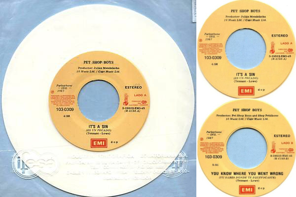 7": 1987 EC (EMI; 103-0309) [Ecuador; spanish titles; jukebox centre; "Es Un Pecado"]