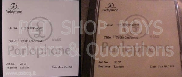 CD-R: 1999 UK (Parlophone; n/a) [labeled "To Be Confirmed"; ref. by T. Jackson; dated 18 Jun 1999]