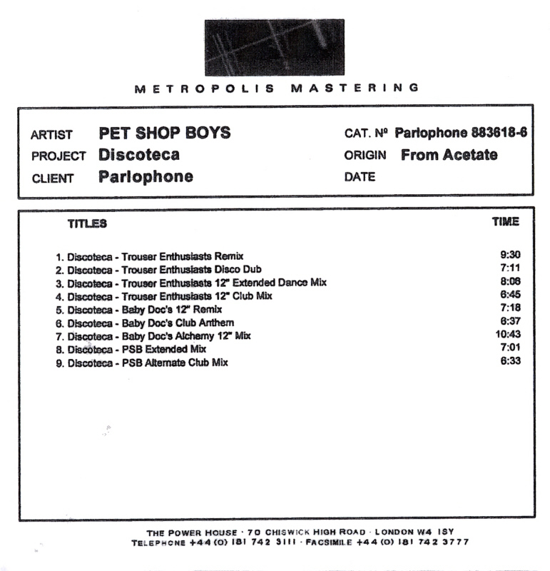 CD-R: 1993 UK (Metropolis Mastering; n/a) [mastering studio acetate; unique mixes]