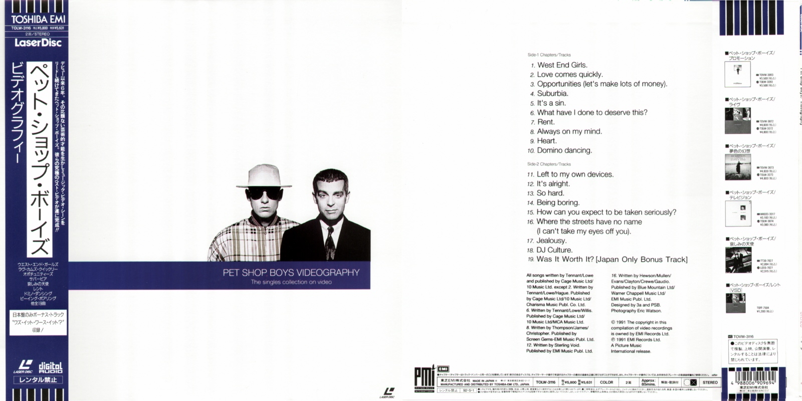 12"LD: 1992 JP (EMI/Picture Music Int'l; TOLW-3116) [NTSC; +one more vid]