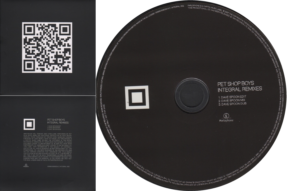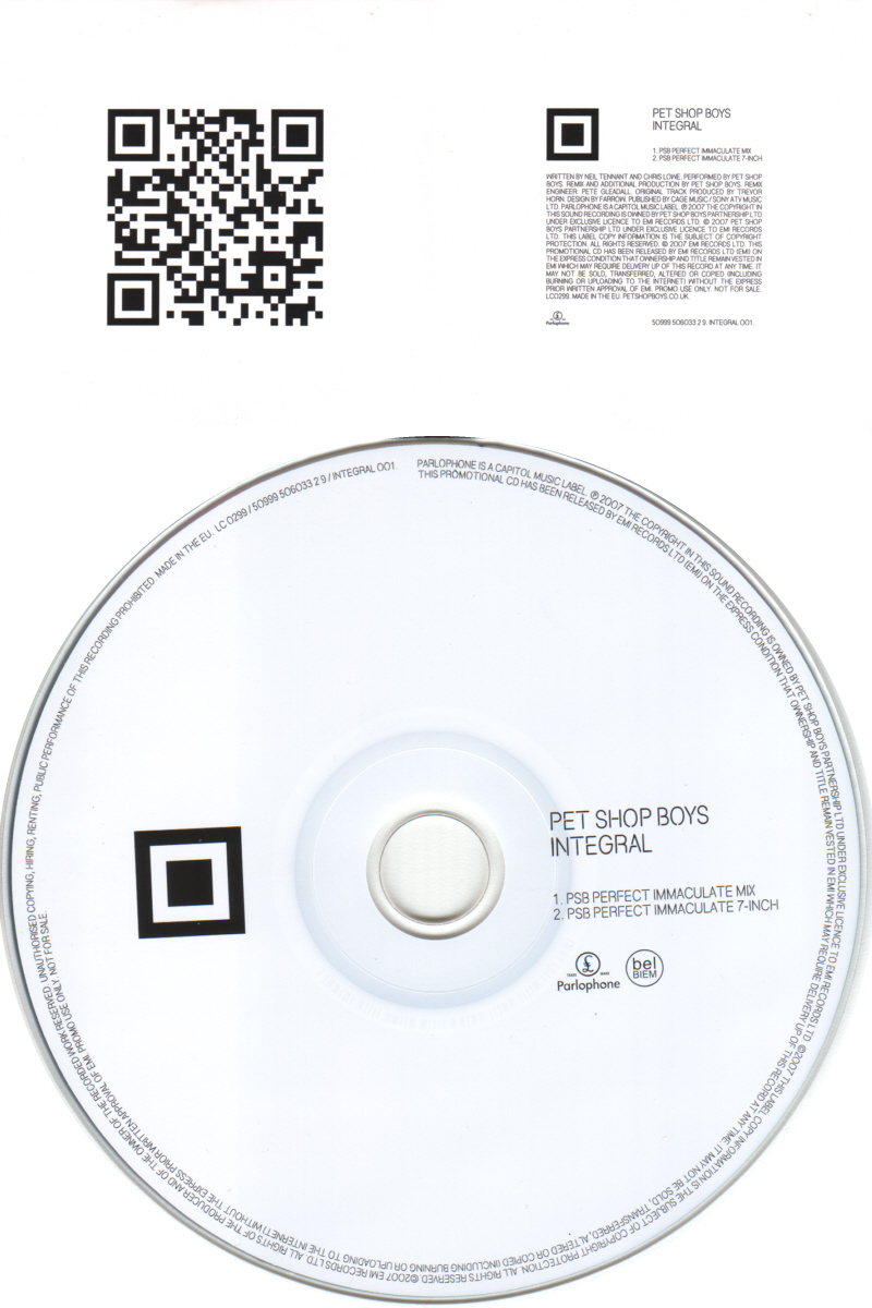 [see also Albums section] Chart: UK #197. CD5: 2007 UK (Parlophone; 5-0999-5-06033-2 9) [promo; "INTEGRAL001"] 7:25 Integral (psb perfect immaculate mix) 3:27 Integral (psb perfect immaculate 7inch) CD-R: 2007 AU (Capitol; n/a) [promo; stickered paper envelope] 7:25 Integral (psb perfect immaculate mix) ["6:37"] CD5: 2007 DK (EMI; n/a) [promotion sampler; +other artists] 7:13 Integral (dave spoon mix) 6:58 Integral (dave spoon dub) ["EMI Music Denmark" sampler CD in usual plastic envelope] DLOAD: 2007 UK (EMI; 5-0999-5-06033-5 0) [digital bundle; +CD ps] 7:25 Integral (psb perfect immaculate mix) 7:13 Integral (dave spoon mix) CD-R: 2007 RU (Parlophone; 5-0999-5-06033-6 2) [bootleg; "INTEGRAL002"] 5:28 Integral (dave spoon edit) 7:13 Integral (dave spoon mix) 6:58 Integral (dave spoon dub) [Remixers: Integral] [David Spoon (David Spoon)] 5:28 Integral (dave spoon edit) 7:13 Integral (dave spoon mix) 6:58 Integral (dave spoon dub) [Promotional Items: Integral] Video; (D: --)