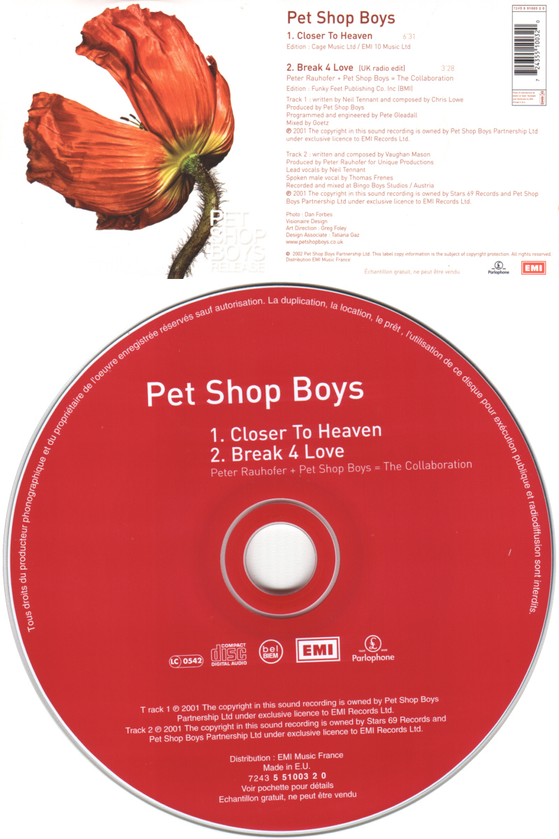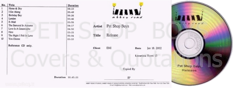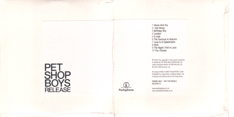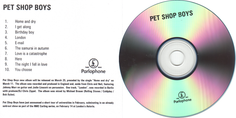 CD-R: 2002 UK (Parlophone; n/a) [silver 10th Planet CD-R w/promo sheet; titled "Pet Shop Boys-Release"]